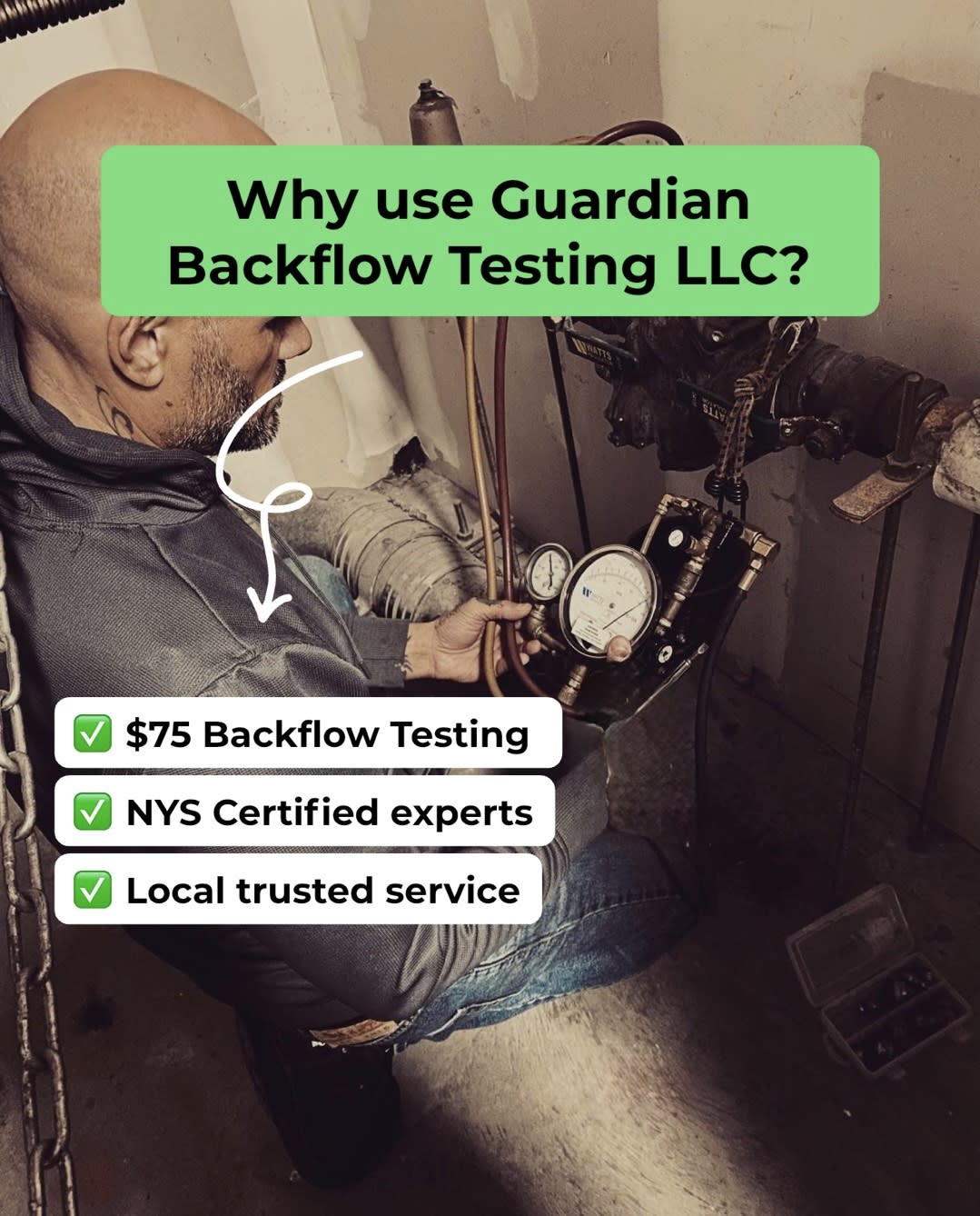 At Guardian Backflow Testing LLC. We offer dependable, certified backflow testing services across all of Westchester County, New York, and we keep pricing simple with a flat rate of ($75) per Backflow Test. Whether you own a residential home or manage a commercial property, our certified testers provide accurate testing, fast results, and full compliance with local Westchester water department regulations.
