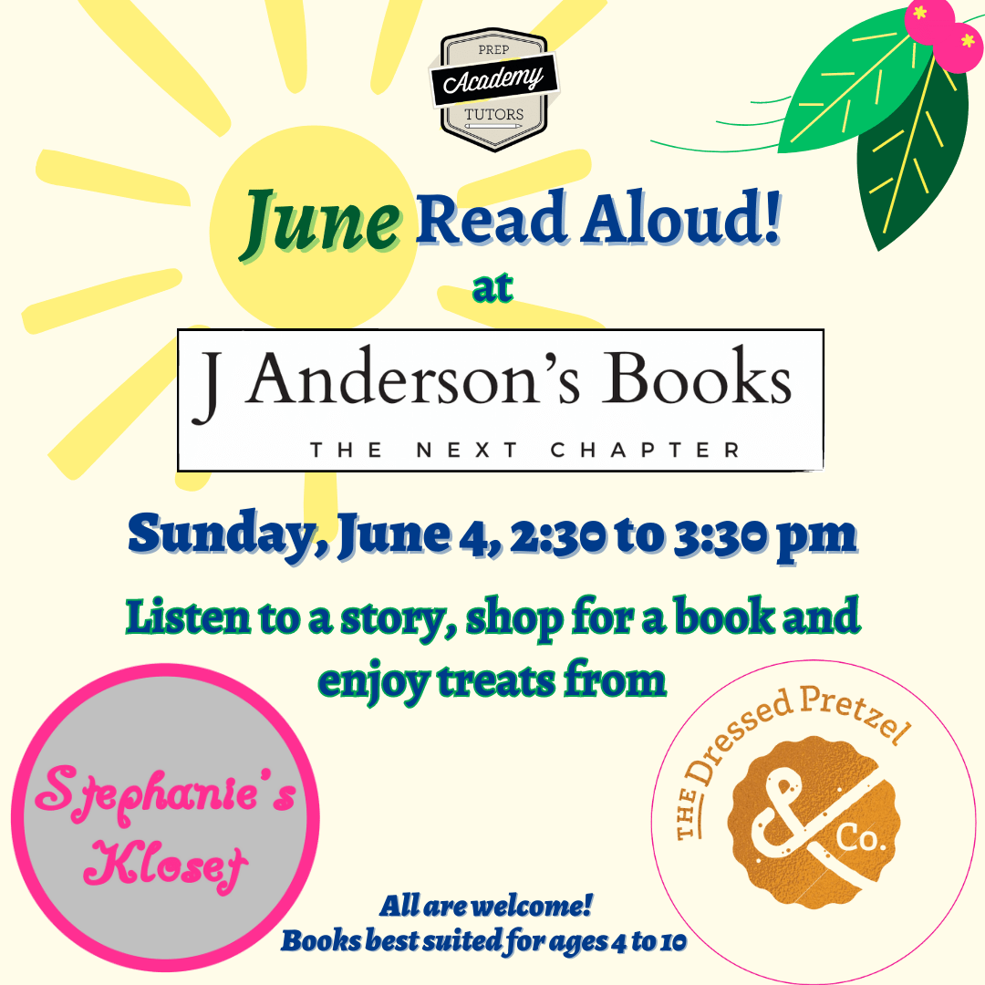 Read Aloud event at J Anderson’s Books on Sunday, June 4, from 2:30 pm to 3:30 pm, presented by Varsity Tutors This is a drop-in event. There is no charge and no registration required to attend. All children and parents in the community are welcome. The books we are reading are best suited for young readers (ages 4 to 10 yrs). Each child that attends our Read Aloud will receive a small ‘goodie’ bag with a Prep Academy Pencil and notepad, PLUS a treat from our wonderful, local event partners Stephanie’s Kloset and The Dressed Pretzel!